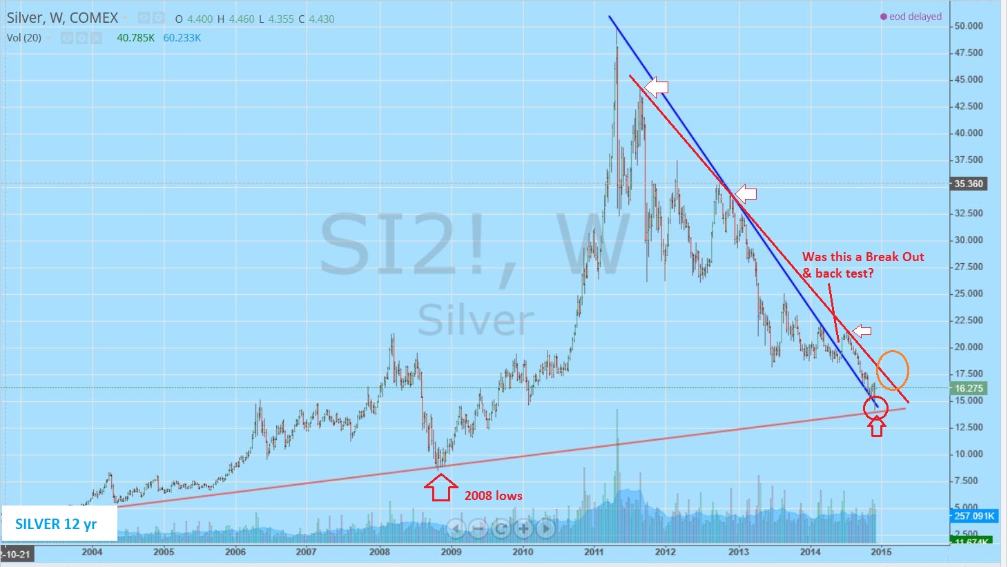 SILVER is pushing against resistance too, but may also have broken out and back tested that break. What next? (Click to enlarge)