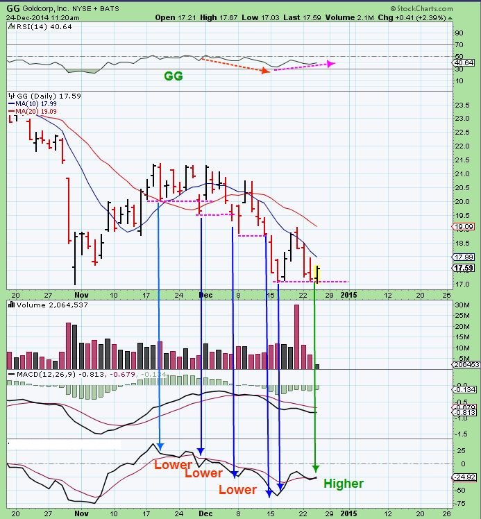 We are still waiting for this recent low to prove itself as the start of the 2nd Daily Cycle in Miners or not, but I looked at a few individual stocks and they show signs of hidden strength. Let me show you GG for example, since it is back by Nov lows and makes up a large part of GDX .