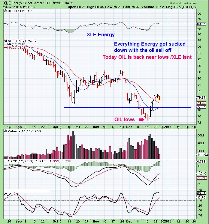 I actually dont know a lot of people who think OPEC will cut. What you wrote is what I have been observing. Its becoming a crowded supply zone, maybe they can beat the competition & put them out of business. They get their oil production at very low cost and they didnt cut production when others thought they would ( I thought they would in Nov). I think they made that clear. As for XLE:WTIC – yes, its a rally because OIL dropped so far so fast, XLE recovering while OIL is still at lows. but What if OIL isnt a bear f;ag? If OIL starts running back to $70 – $80 the way XLE ran up? The energy stocks can continue to recover too… The energy stocks look good – the set ups look fine at this point, so that is ONE thing that I will be watching Friday (Dont take position if you feel risk is higher than reward.)
