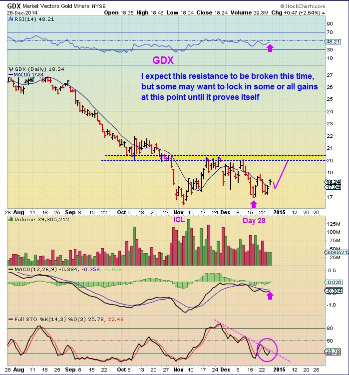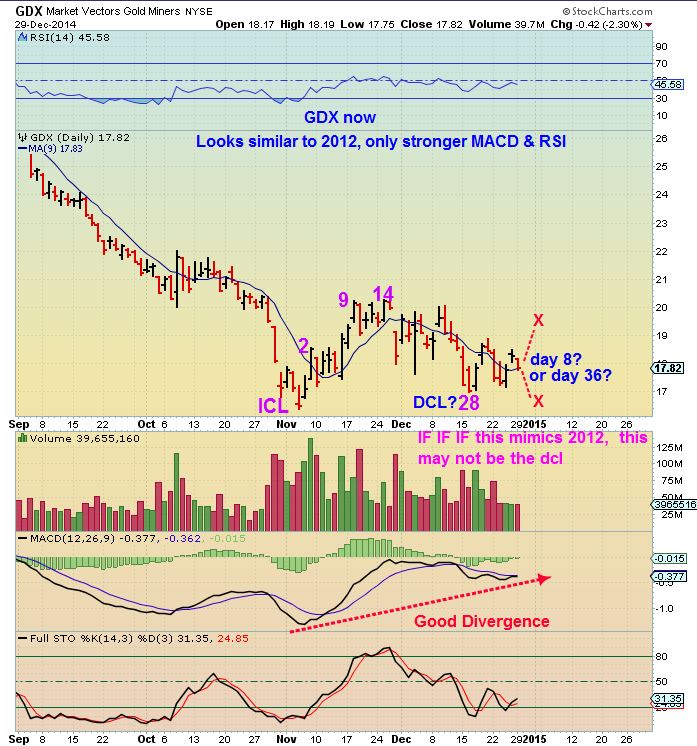 I am trying to prepare everyone to know what to look for when a rally happens ,  because many Miners run ip 100%.  Thats HUGE! I will chart up individual miners when that time comes for good entry and even sell points. I thin January ‘Might be”  a time of profit taking for the stocks that ran up big in 2014 and maybe some buying in Miners like  jan – Feb 2014.  We are overdue,  aye??