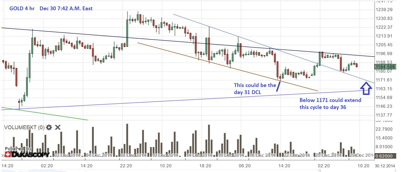 This is a close up of GOLD RIGHT NOW / 4 hr chart .  A drop below $1170 extends the cycle count to day 36, but a POP above $1196 would have bullish implications.