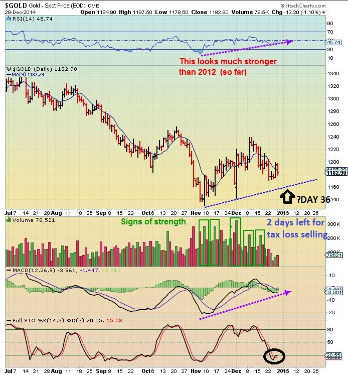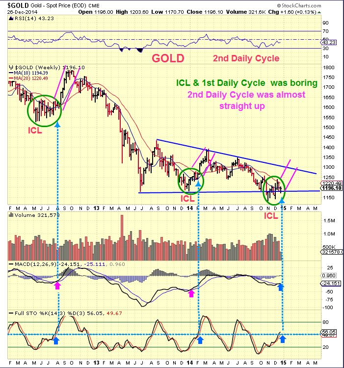 SO-  I hold positions and in January 2014  (After tax loss selling in DEC 2013) it paid off nicely.  Buyers were entering to buy their mners on sale and we rallied for weeks into Feb.  I am NOT saying that you have to buy now,  but I am repeatedly showing you various bottoming processes through out GOLDS recent lifetime,  to help you see that when it DOES get going,  it can rally for 4-6 weeks and you will want to take a position then.  I am just showing everyone this process over & over in many time frames and many different situations to  help you to go long when that time comes along and you feel more comfortable.   It is NOT easy at lows.  I used to be in a few other blogs / Forums,  and we always look back and say  ” I would buy that low with no problem!  The ICL was in, its just a matter of time for a good rally. ”   “In fact,  I will but the next low with both hands!”    And when that low comes,  it is NOT as easy  as it sounds.