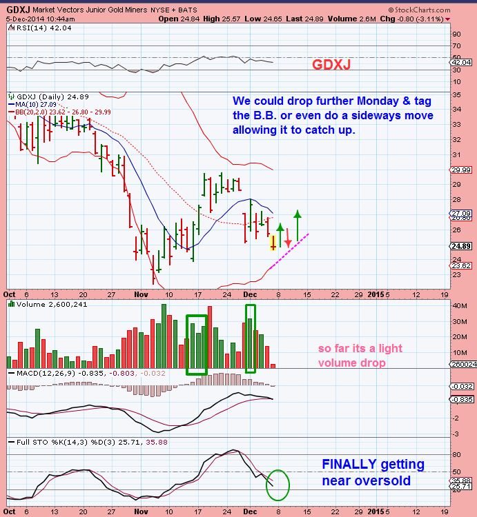 Try to remember, I posted this from DEC 5. This is GDXJ & I expected a possible sideways consolidation to the Bollinger Band. This is exactly what we have down.