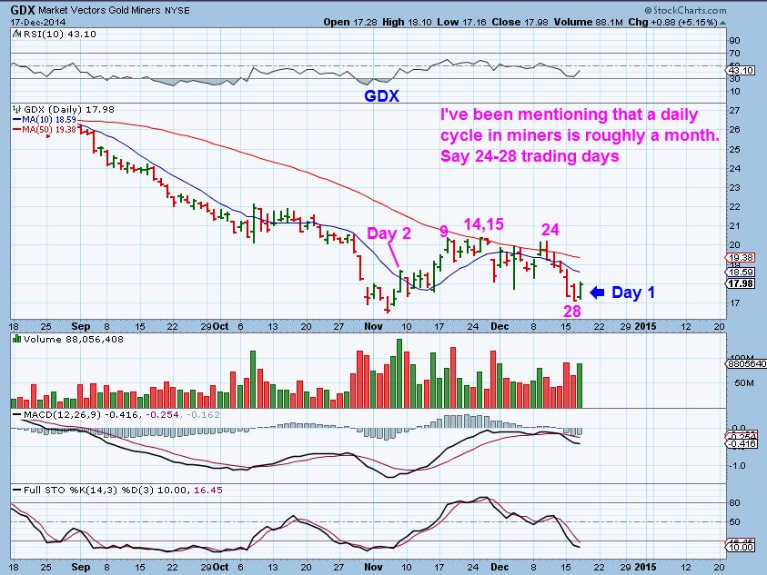 Please notice this ,  it has happened MANY TIMES in the past.  I have noticed the types of “SIGNS” that I mentioned in recent reports.  I look for some Miners not selling off when everything else is.  I look for Miners resisting the $USD up days or $GOLD / $SILVER sell offs.     When I  see that around day 22, 24, 26?  I take note- it may be signs that miners are bottoming first.  It happens frequently.