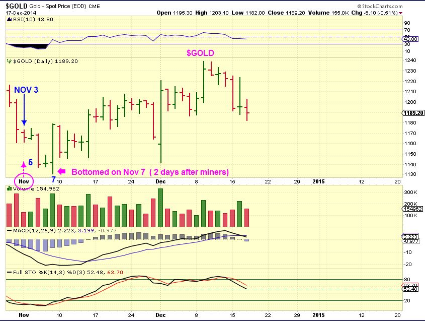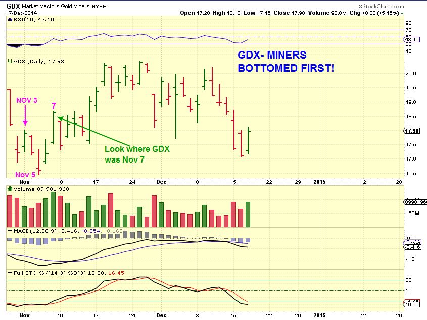MINERS bottomed 2 days before GOLD in Nov 5th & 7th area.  It probably didnt make sense to many that by NOV 7th  miners  were 2 days off the lows & green while Gold was still selling.