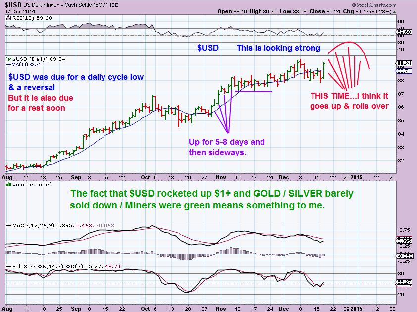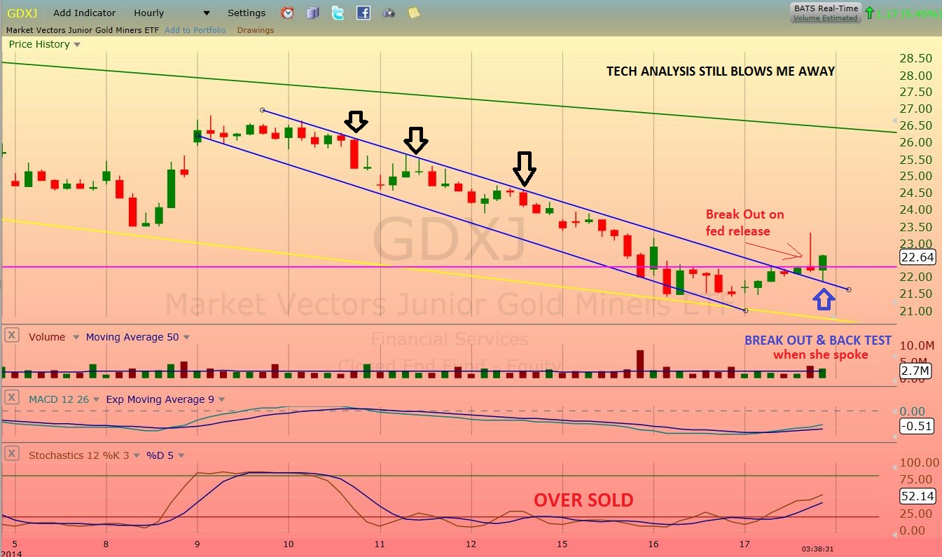 Right now –   This late in the timing for a daily cycle low,  we had a strong reversal while the dollar surged up $1,  GDX & GDXJ  intra-day broke out from a down channel and went back & back tested it 2X as Janet Yellin spoke, A shake out / Recovery in GDXJ is now showing on a daily basis and weekly chart .  HMMM, You might have just seen that on FED WED again.