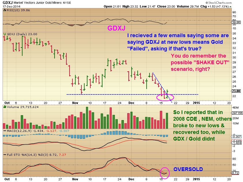 I got a few emails saying that someone is saying that since GDXJ broke to new lows,  it means that the gold cycle is failed.  This is not true at this point.  I showed on here in 2 separate reports that in 2008,  GDXJ didnt exist, but GDX did.  GDX did not break lows,  but I showed some JUNIORS that did…and recovered.   CDE, NEM, etc etc
