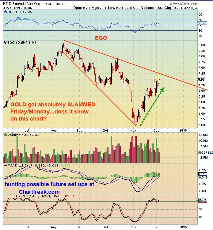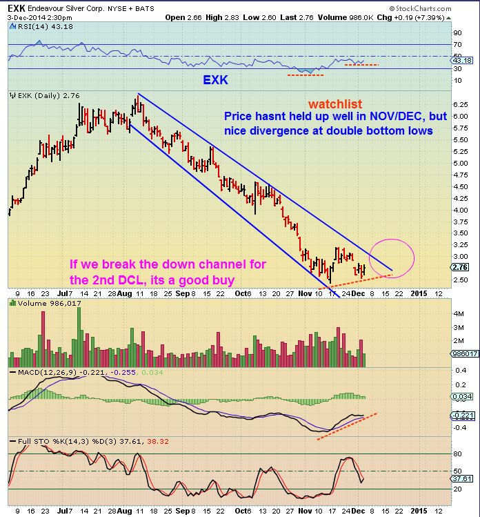 EXK – Here is one that hasnt moved much, but a sweet double bottom low risk entry.  You can BUY NOW with a stop below Nov lows…or buy a break out above its 50sma,  or buy after it breaks above this trendline.  EXK is a good silver stock if you ask me.