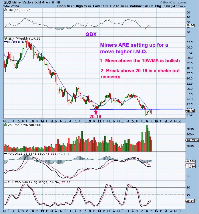 SO this is all lining up as BULLISH behavior, and now I have been saying that for 4 weeks!   I went through charts yesterday and captured quite a few Miners  that you should have a look at too. I am saying that at this point, (And I said it yesterday too) I would take a position if I didnt have one already. UPSIDE surprises can be pretty nice when GOLD/SILVER & MINERS set up like this.   We seem to be at that point where  ALL MINERS will rise together…thus the dartboard picture for the theme pic.  It looks like it might be a “Throw a dart and Buy at least a couple of these set ups”   lets see some charts and remember ,  “WHAT IF THE RECENT SLAM WAS A DCL?” this would be the start of the 2nd leg up …