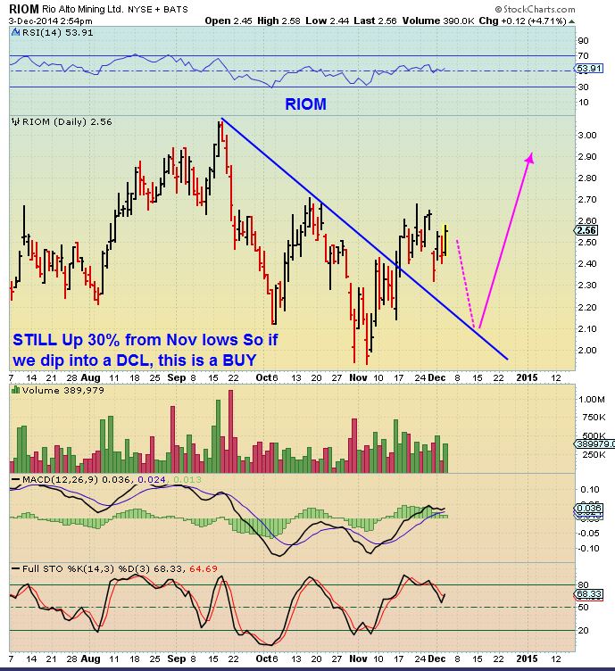 So the recent NOV ICL DIP in RIOM  was a buy, The FRIDAY dip was too.  HOWEVER, seeing how strong this has been in that above weekly chart,  I’d also take a partial position here and IF we get a dip into a future DCL , I’d just add. We may just break out here above the recent high near $2.70 and make a run for highs near $3.10ish.   Then a sideways move could form a cup & handle?  I drew the magenta line in case we drop to a DCL this week. THAT would be a great buy.  Tagging the trend line, inverse H&S , etc