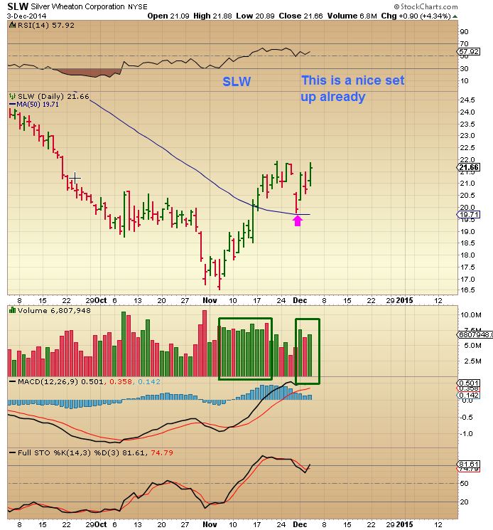 SLW  is STRONG  (A buy when it reversed at the  50sma, or buy now in case of an upside pop and place a stop below the 50sma)