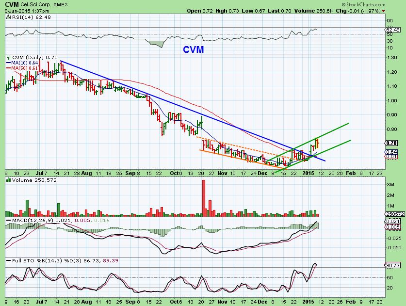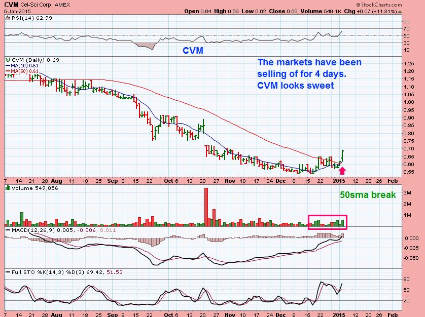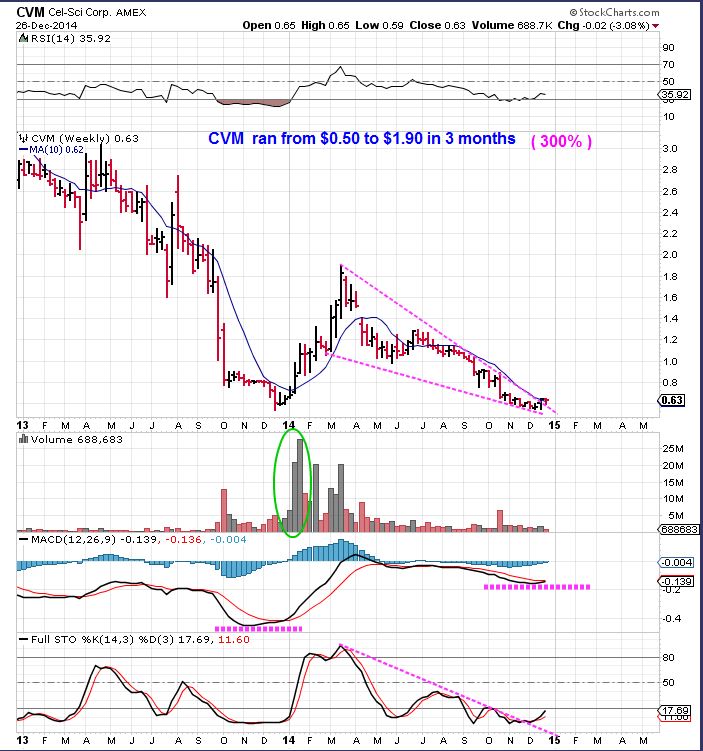 Previously mentioned stocks like CVM , it was 63 cents , but the weekly looked great .