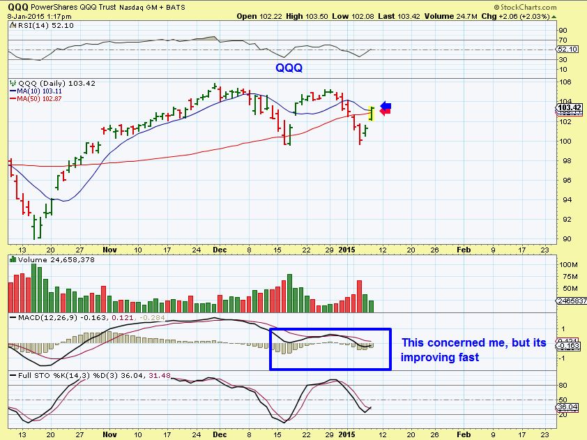 Could we give up todays gains at the end of the day in SPY, QQQ, DOW? THAT COULD HAPPEN, Price could dip into the close under the moving averages and THAT might trigger selling. For now we have to play it the way we see it and I just wanted to point this out in case some were thinking of “Shorting”.