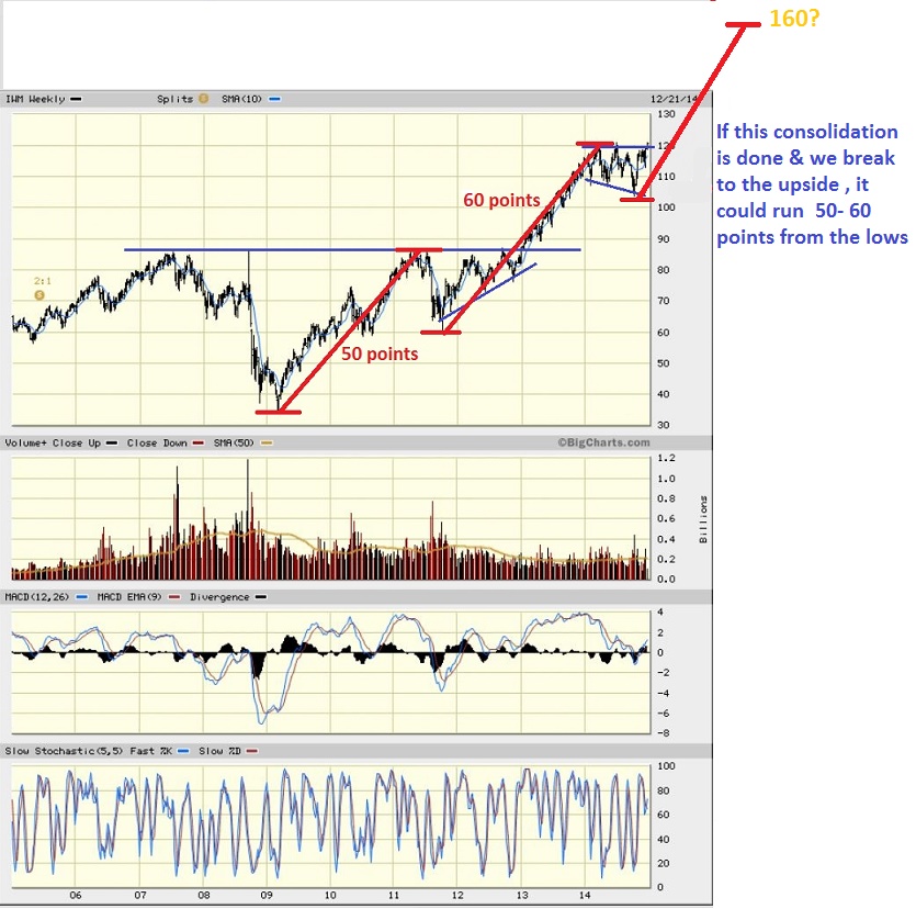 Well after scanning a few chart,  I started again thinking about my recent theory on the markets & how we may  make some nice trades going into and through 2015.   In past reports I have mentioned that IWC / IWM / RUT have consolidated for a yr,  and MAY be the ones that make the  next run up . Microcaps and Small Caps .   I posted this chart