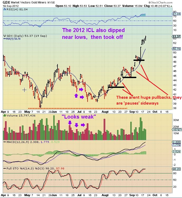 LASTLY  –  I may be a trader and I may sell some positions/ take profit  when I think they are extended.    Maybe I sell some when they hit their 50sma  or if they get extended over the 10sma and 50 sma and I expect a possible pullback,  so I can buy back hopefully lower later.   However, this is  why I am not selling all positions in the Miners .  I have seen STRONG moves in the past and in some, the Miners have just pulled back 1 day , up the next, down the next , up the next – basically a sideways move to those moving averages as they catch up.  I have shown this in these 2 charts .