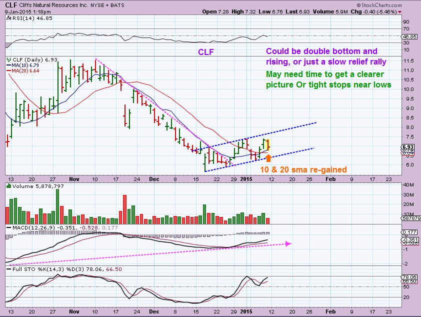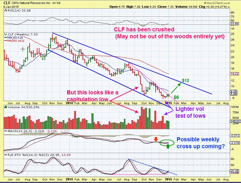CLF  WKLY-  another possible risky stock , because it has been clobbered lately,  but it does have the signs of a capitulation bottom and then a double bottom test.  See the MAGENTA line, and its breaking above it.  Its a wedge.  Those are pretty good set ups and the weekly looks like it may get a MACD cross. Could run (bounce)  from $6 to $12.