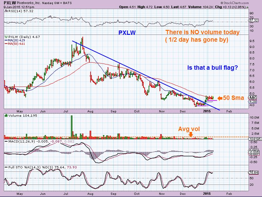I’m not necessarily saying … “QUICK , RUN OUT AND BUY THESE”  ( you could if you are a trader looking for some possible quick trades).  My theory on the markets has been that we may see some great opportunities in Small Caps and Micro Caps this year.   What my intent  here is,  is  to show these types of set ups and you can monitor them going forward.  They dont ALL play out fantastically, but if we get used to watching the set ups ,  see how they may break out,  even start running up,  we can gain confidence in future set ups that I point out.   We can also then enter on pullbacks if they start trending higher.