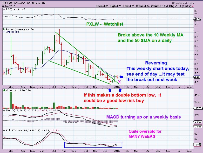 PXLW  WKLY for the watch list.  (On a daily it is actually bull flagging & may break higher) I have been watching this daily for some time.  It seems to be bottoming, and breaking upward. As I’ve shown, they can “test” those break outs , so I am also watching in ase it dips to  X.