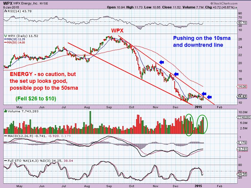 WPX-  ( Watchlist)  ENERGY SO CAUTION!!    Dropping today on light vol.  It does look to be possibly bottoming  and a buy on a break out here is possible, but it’s Energy, so consider it  High Risk for now. If  ENERGY rebounds, this is a nice set up if these lows hold.