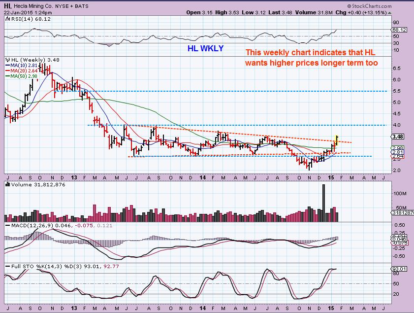 HL WEEKLY-  it should have stopped at $3 on the chart above.  The weekly wants $4.   Also – a break of $4 & small  resistance to $5.50!
