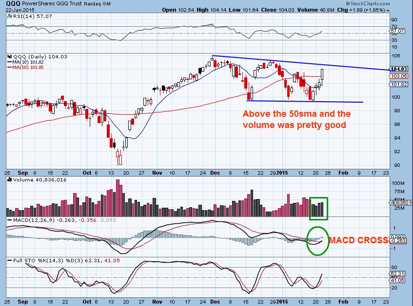 SPY –  Which was struggling below the 50 sma got a bit of a boost yesterday