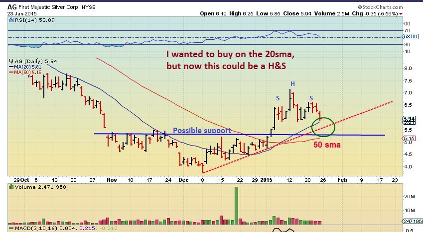 No…I am a trader and some of my readers are too.  The Energy set ups are trade ideas.    If you are just wanting to wait for the Miners…to see what they do,  I have laid out what I an looking for in Miners quite clearly this weekend.  I do expect Miners to bottom before GOLD.  I expect individual miners to possibly bottom  1 by 1 ,  not all at the same time.  For example,   my miner  “AG” is refusing to break down so far today .  I’m watching it closely.   I posted this on the weekend report , but this is it today with GOLD Down over $16 and SILVER down over .40