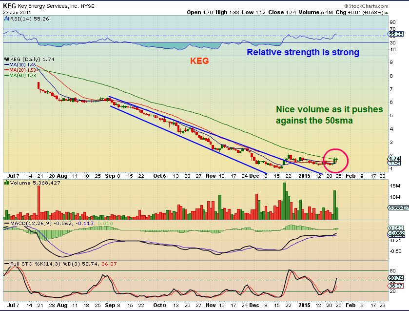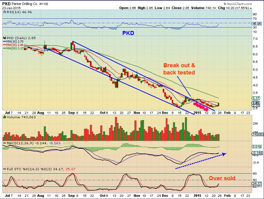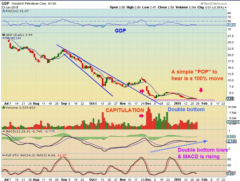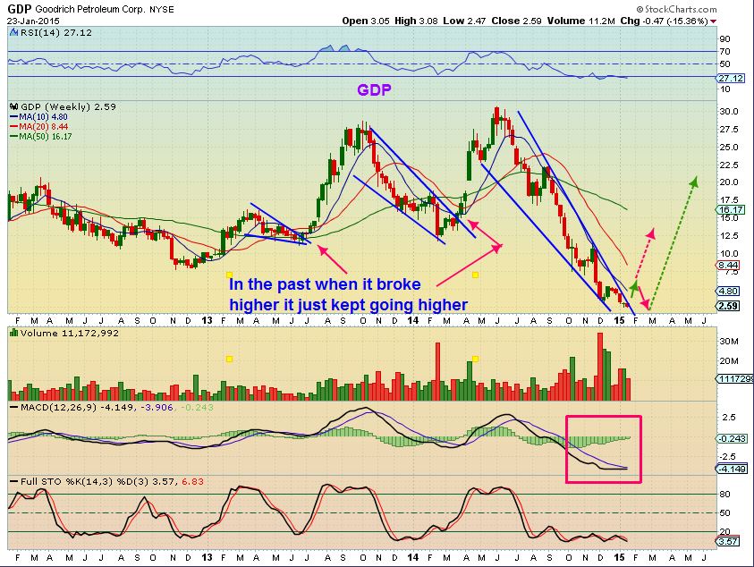 The ones that I have listed above are bottoming and ready to be bought.  THERE IS ALWAYS A RISK OF DOWNSIDE in any trade,  so look for a good place to set a stop & if the trade goes against us,   we move on or re-group and unemotionally look for another set up.   There are plenty of these set ups   (  SD, ERF, AXAS, CPE, TPLM, etc)    and that leads me to believe we are seeing a bottoming process in Energy.    Is it just a Bounce or a real bottom?   Do you remember when Miners were bottoming?  I said that I cant tell if its going to just be a bounce or a nice run,  but the set ups looked correct and proper.   They look good in Energy now too…I have patiently stayed away from requests to give some an energy play or two, because they looked too risky.  Now I see something that looks more like an upside bounce or a run coming.    I will play the bounce, but if volume starts to swell /  grow on the way up,  I would hang on for the ride.