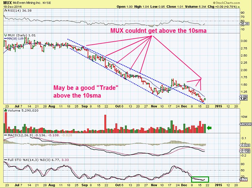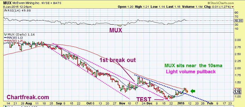 JAN 8 …Mux . It moved up to $1.30 ( 30+% move ) & has now dropped back to the 10sma. Watch it and if it looks like its starting to move higher again, it my be a nice trade.