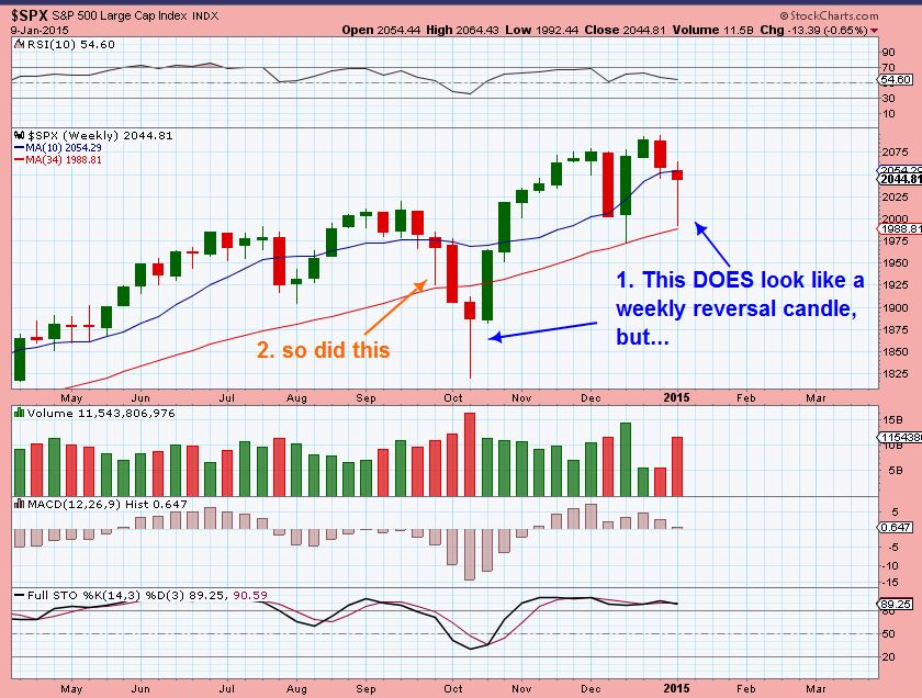 This is the SPX WKLY at the end of last week. Notice that It DOES look like a reversal candle on the 34WMA, but we had that in Sept and sold off the following week.