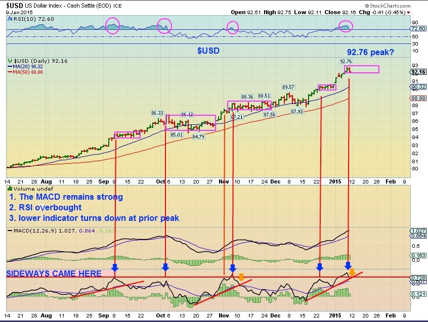You may recall that I posted this chart in early Dec with a 92 target, and wasn’t sure that it would get there. I saw GOLD Bottom and pointed that out as early as Nov 5 & 7 onward, and since I expected a back test of a recent break out, I thought it would pause & pullback . Well, I was right about GOLD, but wrong about a $USD pullback in Dec. It is strong , an it definitely got to and slightly above 92.