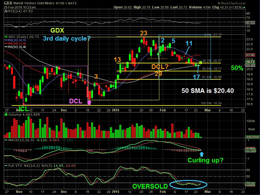 GDX FEB 25- Allow me to throw an idea out there. Did we just have our first daily cycle (Pink Box), our second daily cycle 29 days ( yellow box) ,and 3rd daily cycle? ( blue box). THIS CHART shows that if we did…the 3rd daily cycle topped on day 5 and was very weak. OUR MACD is already trying to curl up? The MINERS didnt even sell off 50% in 3 daily cycles?