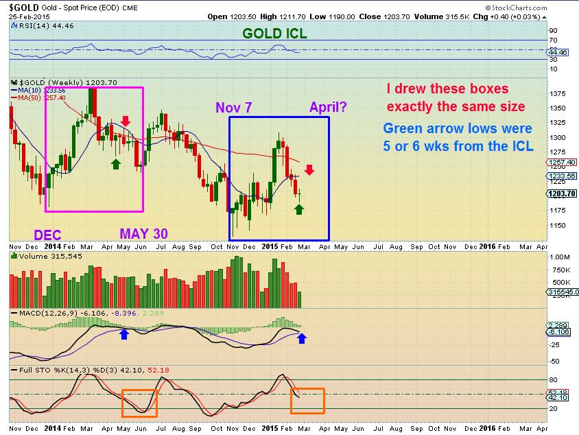Lets examine something interesting. This is GOLD in an ICL BOX. That means lately an average of 6 months from DEEP LOW to DEEP LOW that produces those strong longer term rallies. The green arrows point out similar time frames and this looks the same as last spring. This projects an ICL in GOLD likely in April. Notice the 10WMA is $1230 area and stopped the bounce last April. AGAIN the gold target of $1230 to watch.