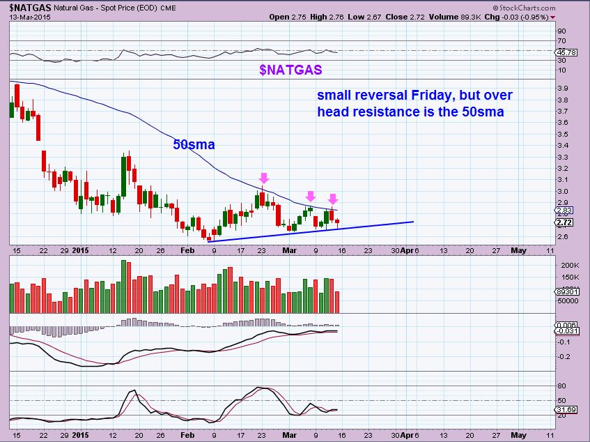 NATGAS – dropped on light volume Friday and had a small reversal, but still struggles at the 50sma. This week should clarify the intended direction.