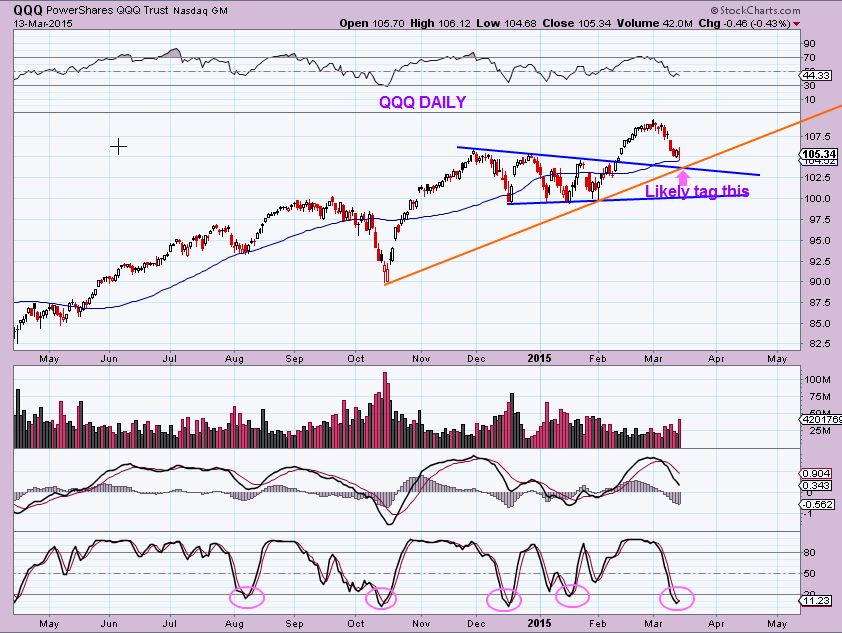 As time went on, a daily cycle low was closer so it had to be excepted that it could now drop to a daily cycle low.  I posted this chart March 9. TAG THE BLUE TREND LINE ?