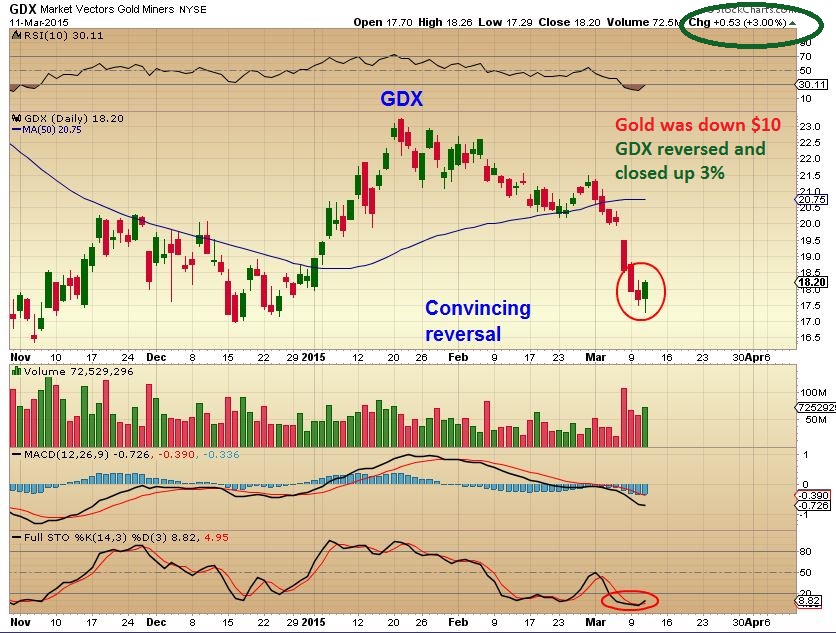 GDX yesterday- looks very convincing . Hit new lows and reversed, nice volume, oversold. IS THIS A GUARANTEE of a run up to the 50sma?