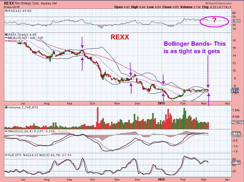 REXX is an extremely Tight B.B. ( I own this). The MACD is steady , but the RSI turned down. I have expected a break higher, earnings are already out and it has been a steady consolidation. As an owner of REXX, I am watching this one closely. I hate to say this, but I expect a break really soon, and in the past , B.B. Squeezes have in the past broken out falsely only to run in the opposite direction. This could get tough.