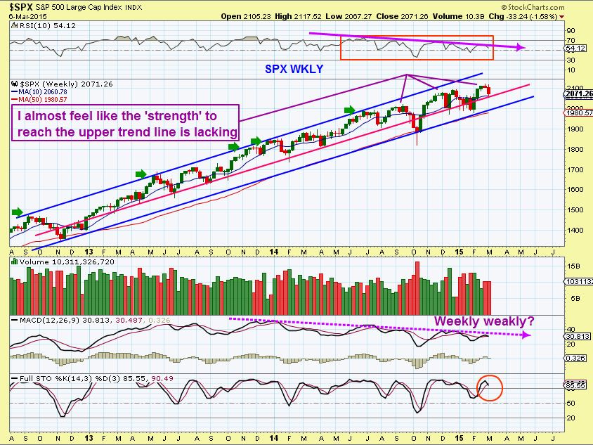 The SPX WEEKLY has not been strong enough to reach its Upper Blue Trend Line on a wkly chart. Weakening MACD, RSI, and Price would indicate a possible weekly top is forming. How big of a drop & exactly when? Its difficult to tell from Middle Ground.