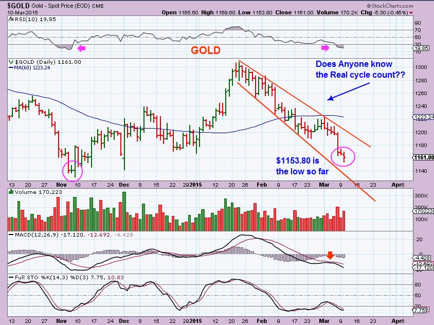GOLD – The count seems unclear and I have seen in trading blogs many keep trying to go long with each intraday bounce. It has hurt their funds, but now I think we are very close to a temp bottom. ( Gold is RED pre-mkt as I write).