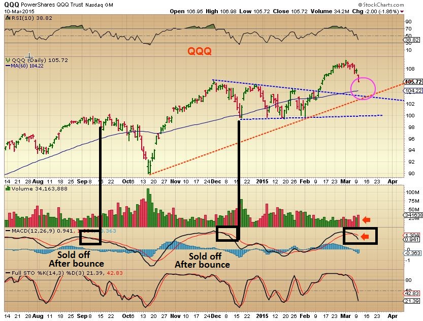 Yes, the futures are green, but is it just a bounce? Notice what I wrote on the following chart of the QQQ’s…