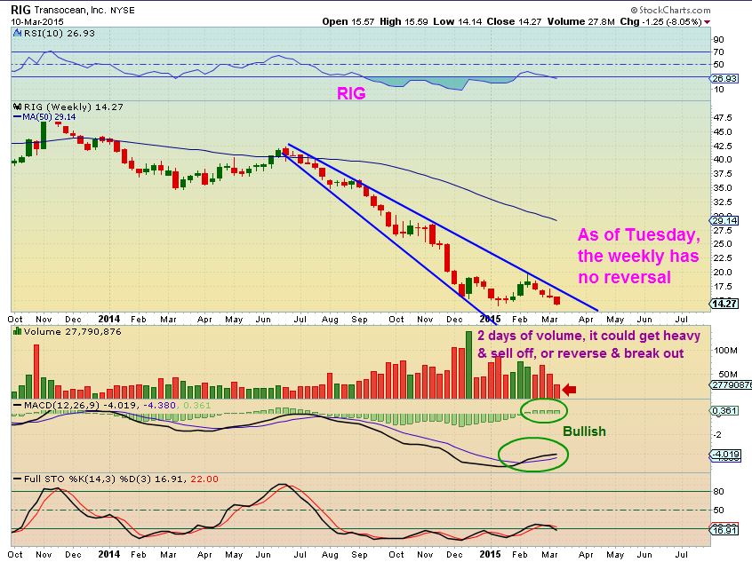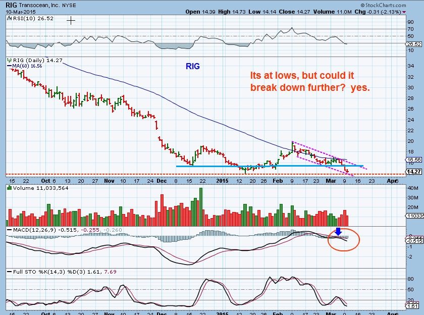 RIG DAILY – It may be at lows, but it also could break down further. A trader could take a chance with a close stop, since it is oversold a little , and at Jan lows. It may sell off further with that MACD cross down .