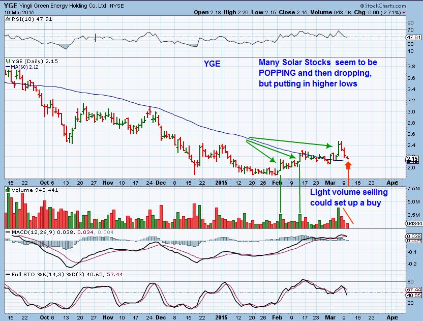 SO the markets in various sectors are jumpy , choppy, and difficult to manage at a low risk level. They gap open and sell off, the POP & DROP, etc . There is risk in each trade. I see some trading blogs where people will post 10 picks everyday. maybe they see 10 stocks that sell off & suddenly gets a reversal, or 10 break outs to buy , etc . Its exciting, but NOT low risk. Often you’ll see the set up they posted pops the next day ( Like YGE & SOL did ) and then give it up & drop for days again. I have entered a couple of Solar stocks that do that, Uranium, etc . It was a trade for no gain if held for more than a day , and that kind of trading isnt for everyone. Those who work fulltime cant manage positions like that, so I want to try to find some trades that can be held for a while . Now those stocks MIGHT be bottoming and setting up for a more sustained run, but that takes time. If we are patient , they do come along after pullbacks and offer some decent buy set ups & entry points.