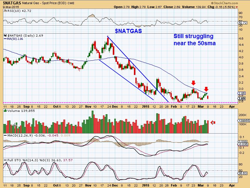 $NATGAS-  It still seems to be bottoming here.  I do not expect a major break down,  but I realize now that I am starting to hate the bottoming process as a letter writer.  In reality,  I have made most of my best %-Gaining trades after a sell off / correction  and then taking trades rising off of the bottom.  It can take patience but it also can really pay off, even if it means you get stopped out a couple of times.  Why?  Lets say you get stopped out for a 5% loss, then it happens again.  Then you re-enter and your stock has bottomed and runs from $3 to $6. 100% gain vs two 5% losses.