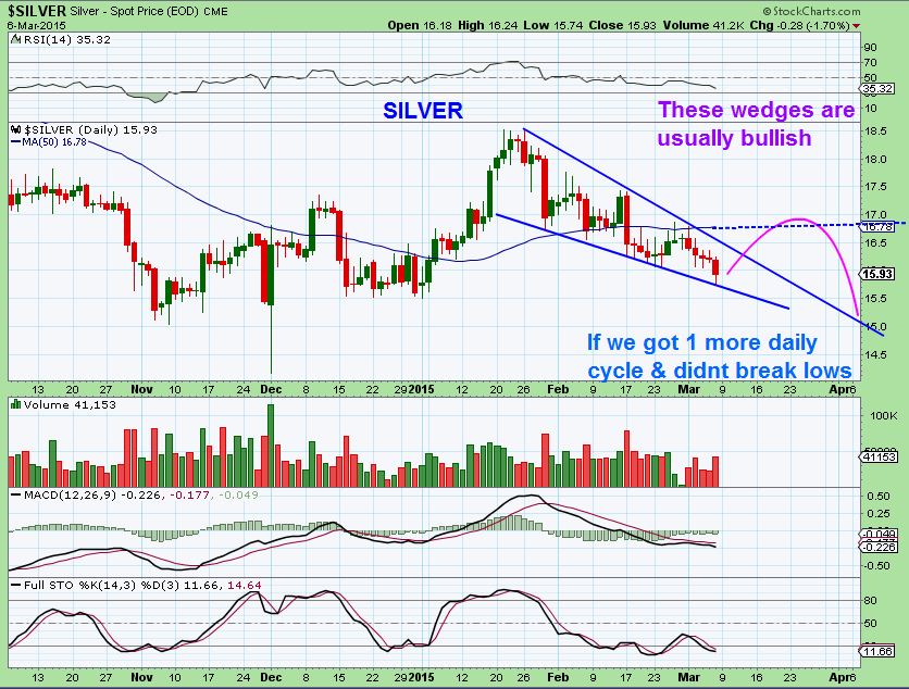 SILVER– I actually think Silver looks bullish and showed this chart yesterday.  It hasnt changed , except it too has a slightly lower low.  It looks like SILVER hit near $15.58ish. Still on that blue line.  This too could break out & roll over  ( A ‘Test” of the break out).