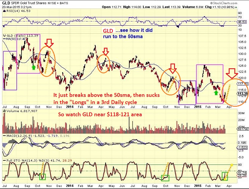 Sorry for this cluttered chart , I drew this for a friend last week . I was simply showing that GLD often breaks ABOVE the 50sma in a late daily cycle ( orange circle) , sucks in more “longs” , and then drops. I am watching that area $117 – $121 area.