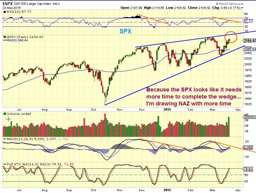 SPX – is also a Wedge that doesnt look complete. Sure, they can fail at any time, but since this has been a strong bull market, I expect a move closer to the apex.