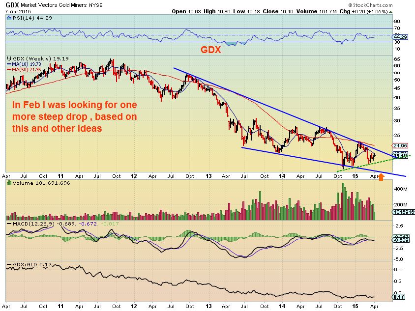 LONG TERM BIG PICTURE – GDX appears to be in a bullish descending wedge .  This could still break down and put in final lows much lower if the ICL (Deep trade-able lows) were still ahead. I keep saying that a close above $20 is important to me, so I am still watching.