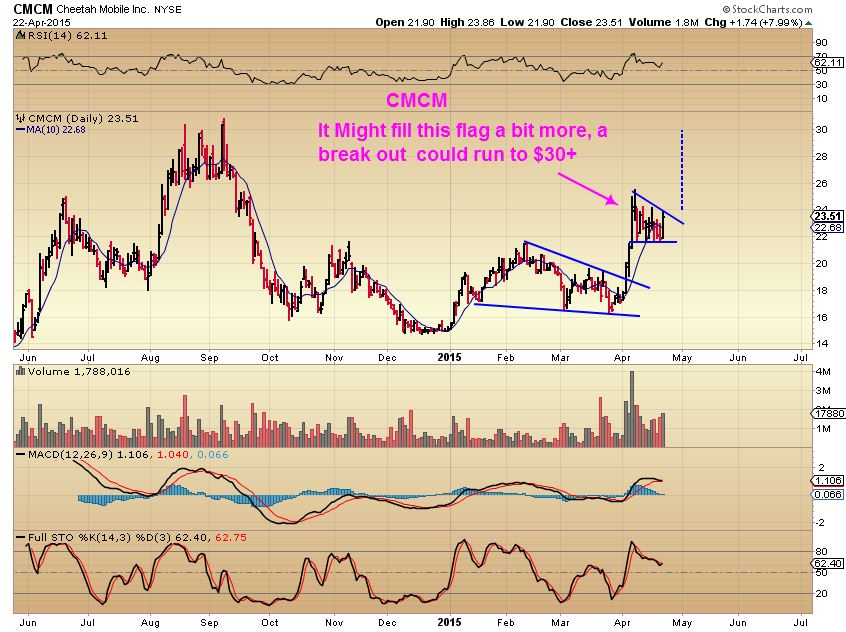 CMCM – Now . Please notice the huge period of consolidation after running up to $20, back down to $16! Then straight up to $25. Now bull-flagging between $21.75 & $24. The break out from here could take it to….$30.