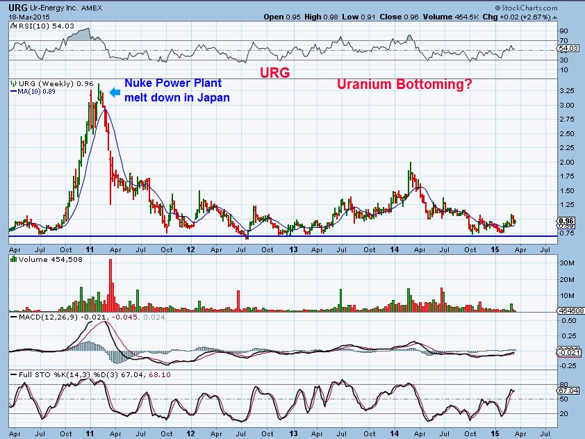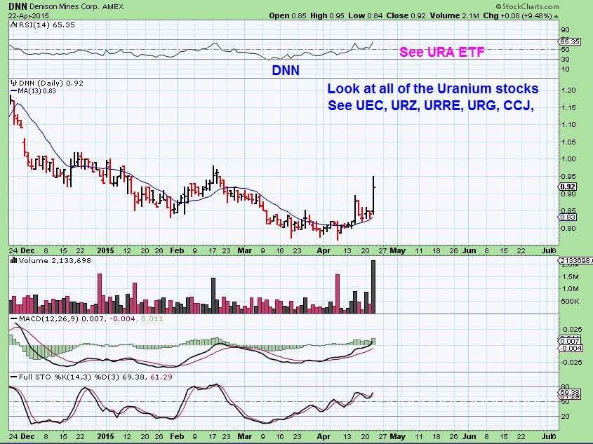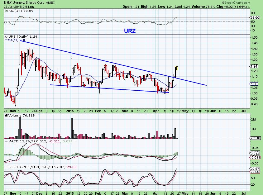 Scroll back up & notice how SOL formed a ‘base’ first . Many times the base process is difficult to endure as a trader. I believe we are seeing Bases form in many commodities , including our energy stocks. These can lead to great gains when they break higher. Back in Feb I was pointing out the action in Uranium stocks . They were forming bases and Popping up, and dropping back.