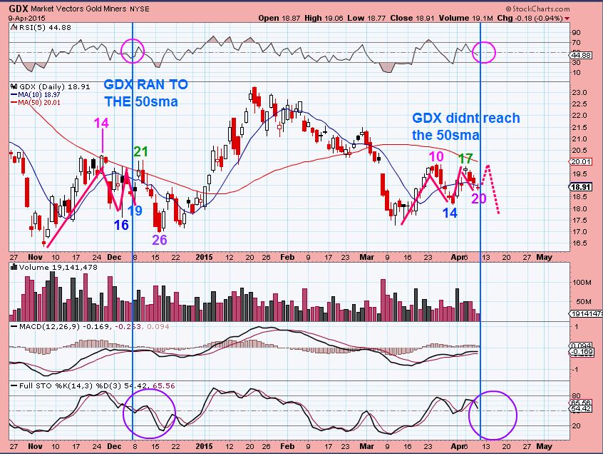 APRIL 9 – I pictured GDX popping up to tag the 50sma, then drop. I drew this & cautioned not to buy GDX unless it closes above $20