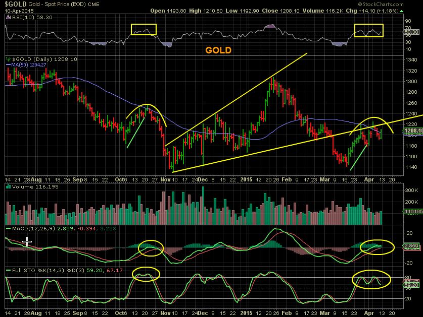 I posted this chart on APRIL 10 for GOLD. It cautioned that we might just be doing a back test of the yellow line and then a rounded top / drop. The drop would bring us to a good buying opportunity.